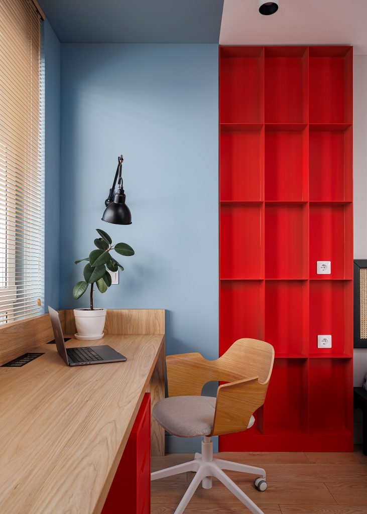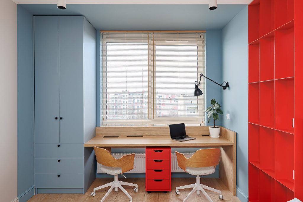 Робочий простір організовано за принципом зонування та кольорових акцентів. Зберігання речей організовано за допомогою шафи-корпусу у голубому димчастому відтінку. Оксамитова матова текстура Velvet надає фасадам преміального вигляду, візуально розширюючи кабінет. Контрастним акцентом виступає тумба у червоно-кораловому кольорі.