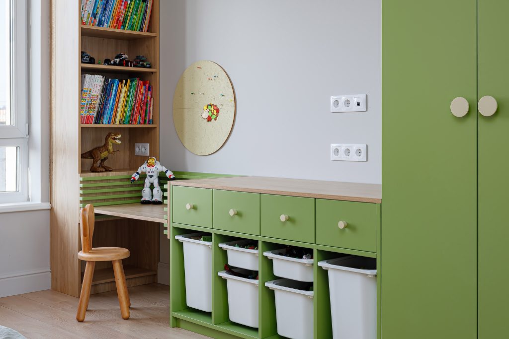 Дитяча кімната – це гармонійний простір, де панують природні текстури та спокійні акценти. Робоча зона укомплектована стелажем та кришкою для регульованого столика, що виконані з ДСП Egger у декорі “Дуб Сорано натуральний світлий”. Матеріал автентично відтворює фактуру дерева, а матова структура ST9 Smoothtouch Matt забезпечує приємні тактильні відчуття та високу стійкість до подряпин, що важливо для щоденного використання.