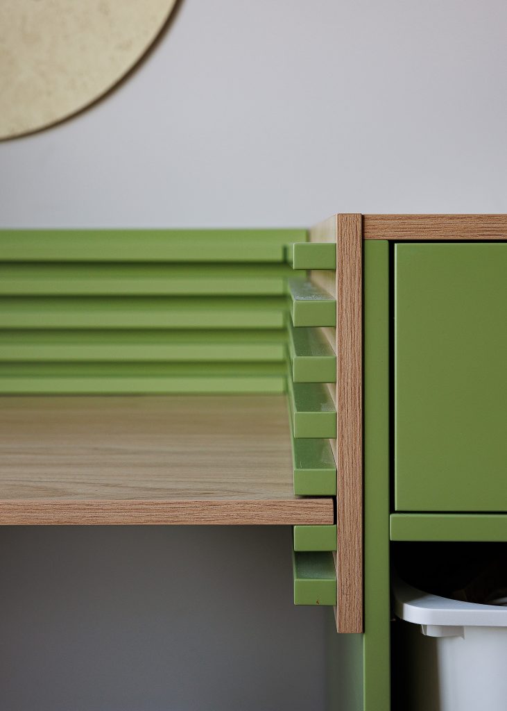 Витонченим доповненням стали планки на стіл, виготовлені з фарбованого МДФ у природному оливковому відтінку. Стійке покриття зберігає насиченість кольору з часом, додаючи інтер’єру завершеності та спокійного природного настрою.