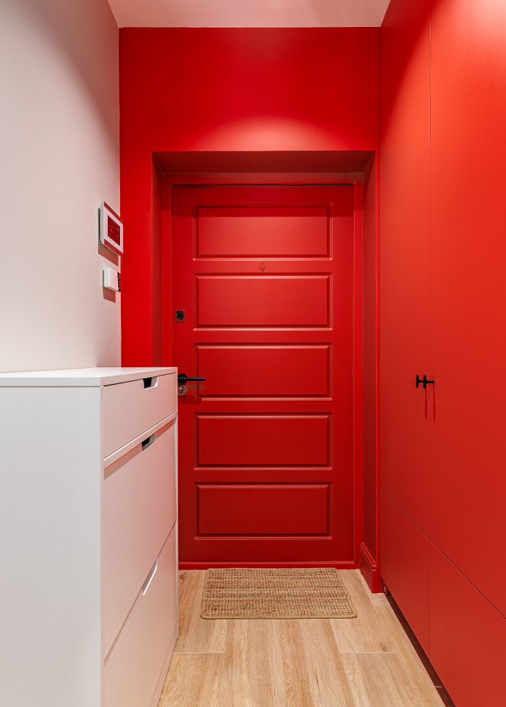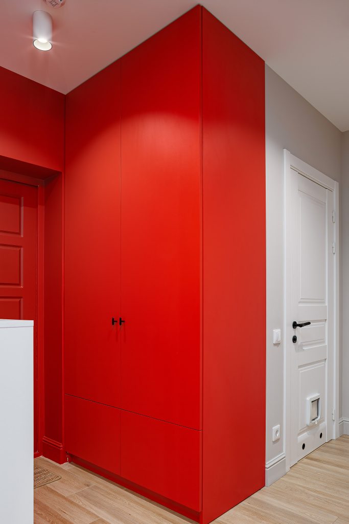 Акцентом приміщення є шафа у насиченому червоно-кораловому кольорі. Оксамитово-матова поверхня Velvet пом’якшує яскравість фасаду, а преміальна накладна ручка Hafele H2140 підкреслює сучасний стиль. Поєднання стійкого до зношування ДСП та німецької фурнітури робить цю шафу надійним і функціональним елементом інтер’єру.