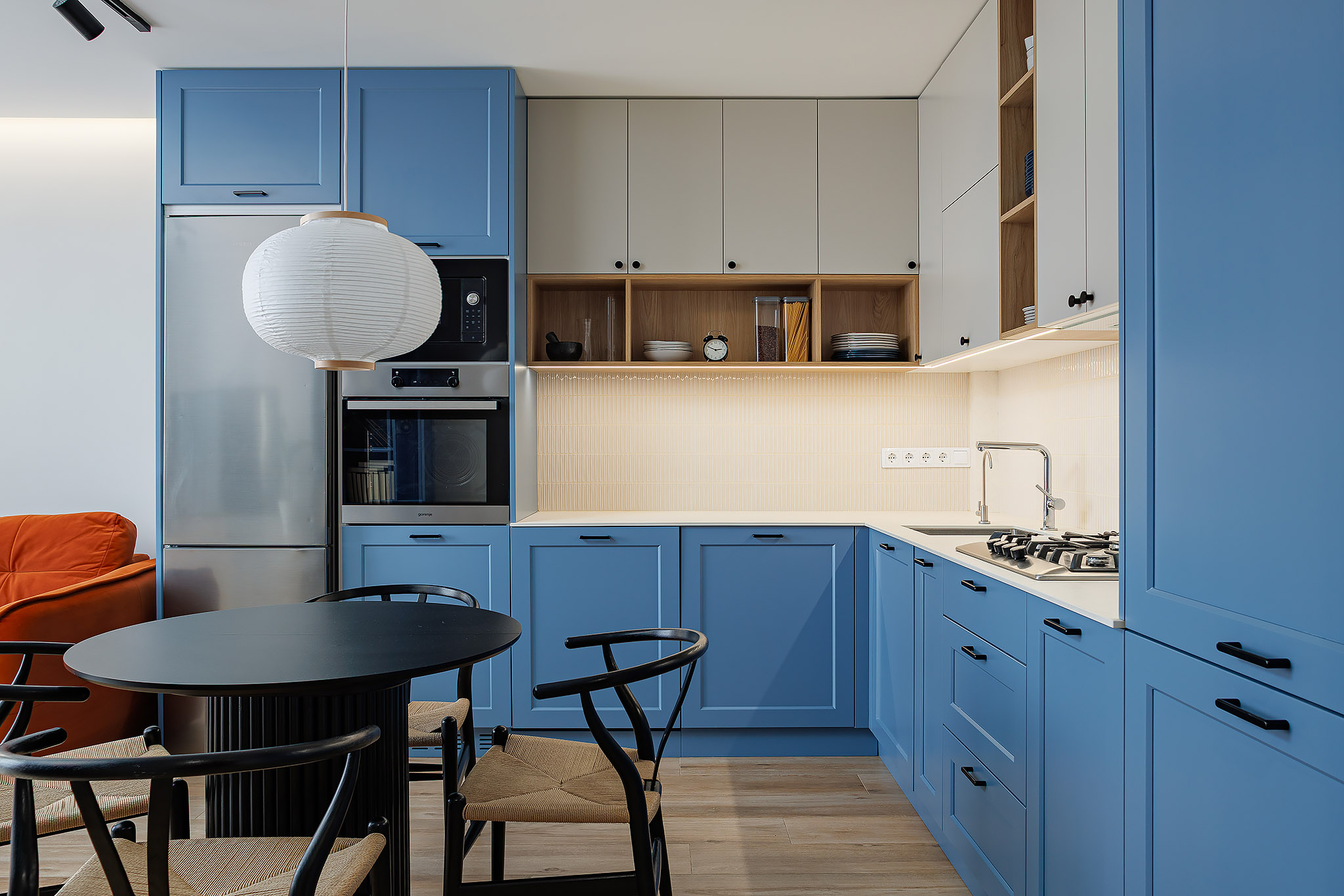 Простір кухні-студії об’єднує передові технології та природну естетику в єдиний функціональний ансамбль. Кухонний гарнітур виконаний у комбінації білосніжного корпусу Kronospan та текстурних елементів “Дуб Сорано” (Egger). Фасади з фарбованого МДФ доповнені зносостійкою стільницею з HPL-пластику, що гарантує захист від вологи та температур. Плавну та безшумну роботу всіх механізмів забезпечує преміальна фурнітура Blum.