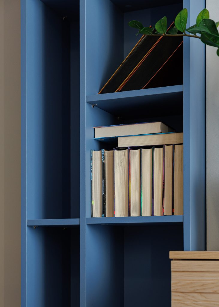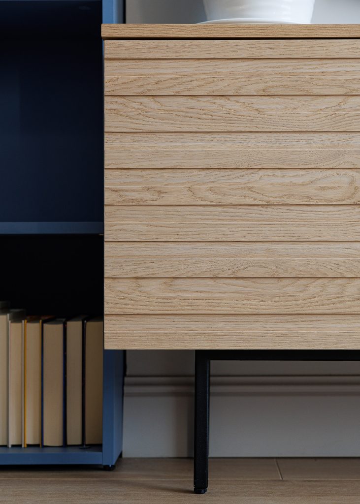 Зону відпочинку доповнює TV-тумба на матовому металевому каркасі. Корпус із ДСП Egger гармоніює з рейковими фасадами з натурального шпону дуба, створюючи цілісний візуальний образ. Фінальним штрихом вітальні став стелаж у глибокому відтінку «Голубиний синій» з приємною на дотик оксамитовою поверхнею.